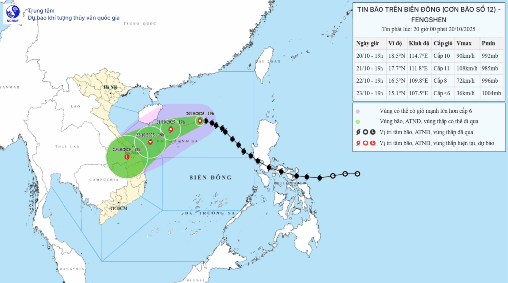 | Hình 1. Bản đồ dự báo quỹ đạo và cường độ bão số 12 phát lúc 20h00 ngày 20/10/2025 |